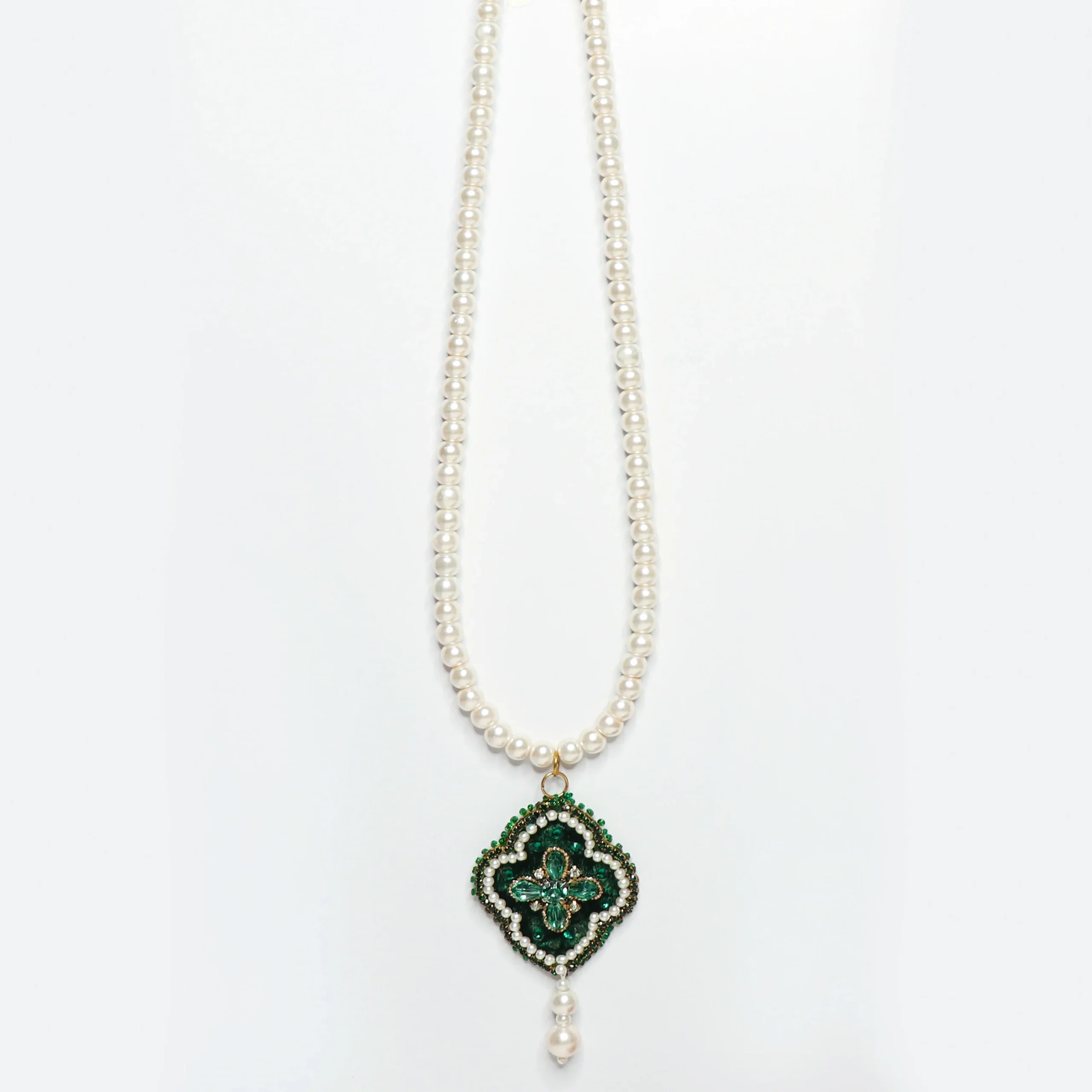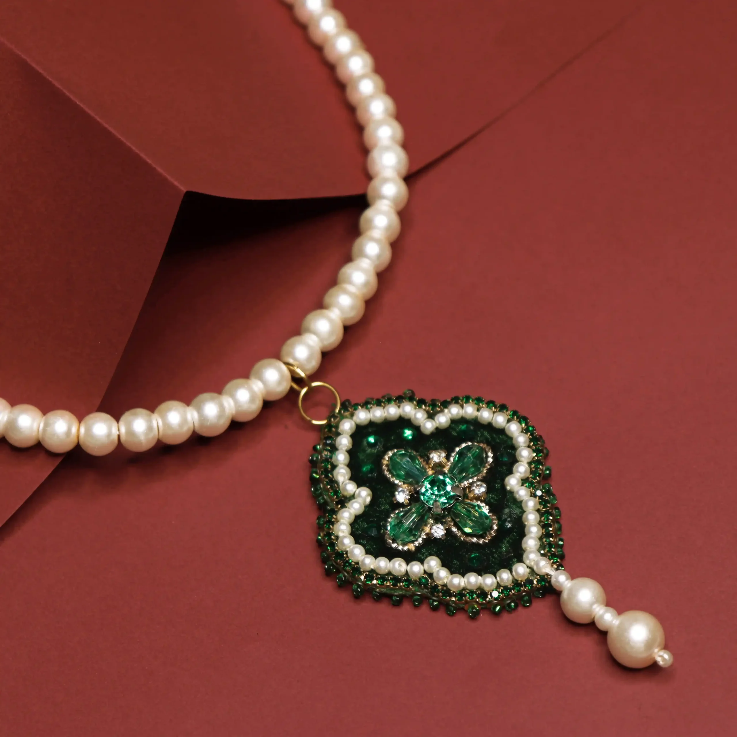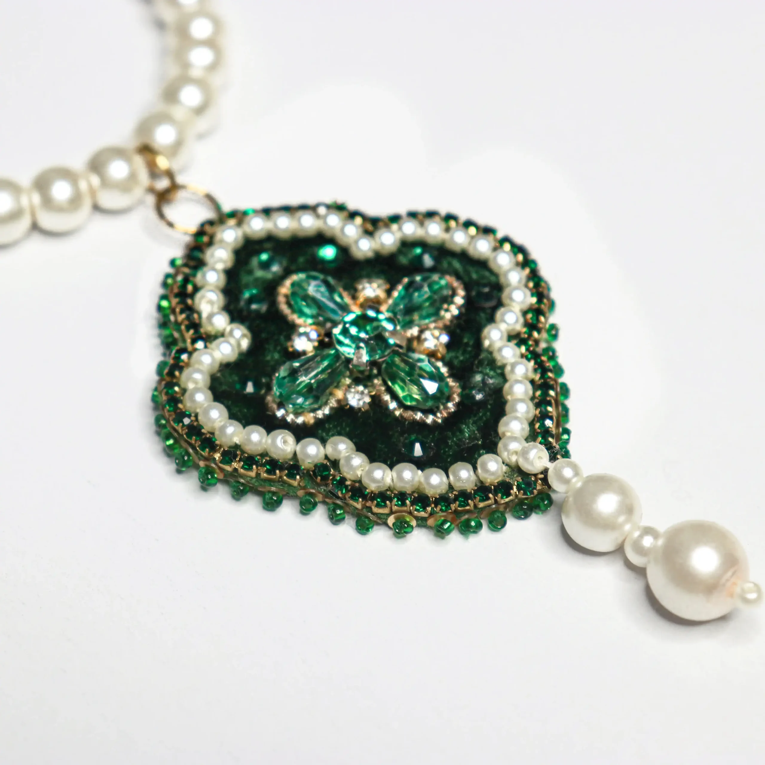 The Spirit necklace is a stunning piece of craftsmanship featuring delicate hand-embellishment on velvet.
