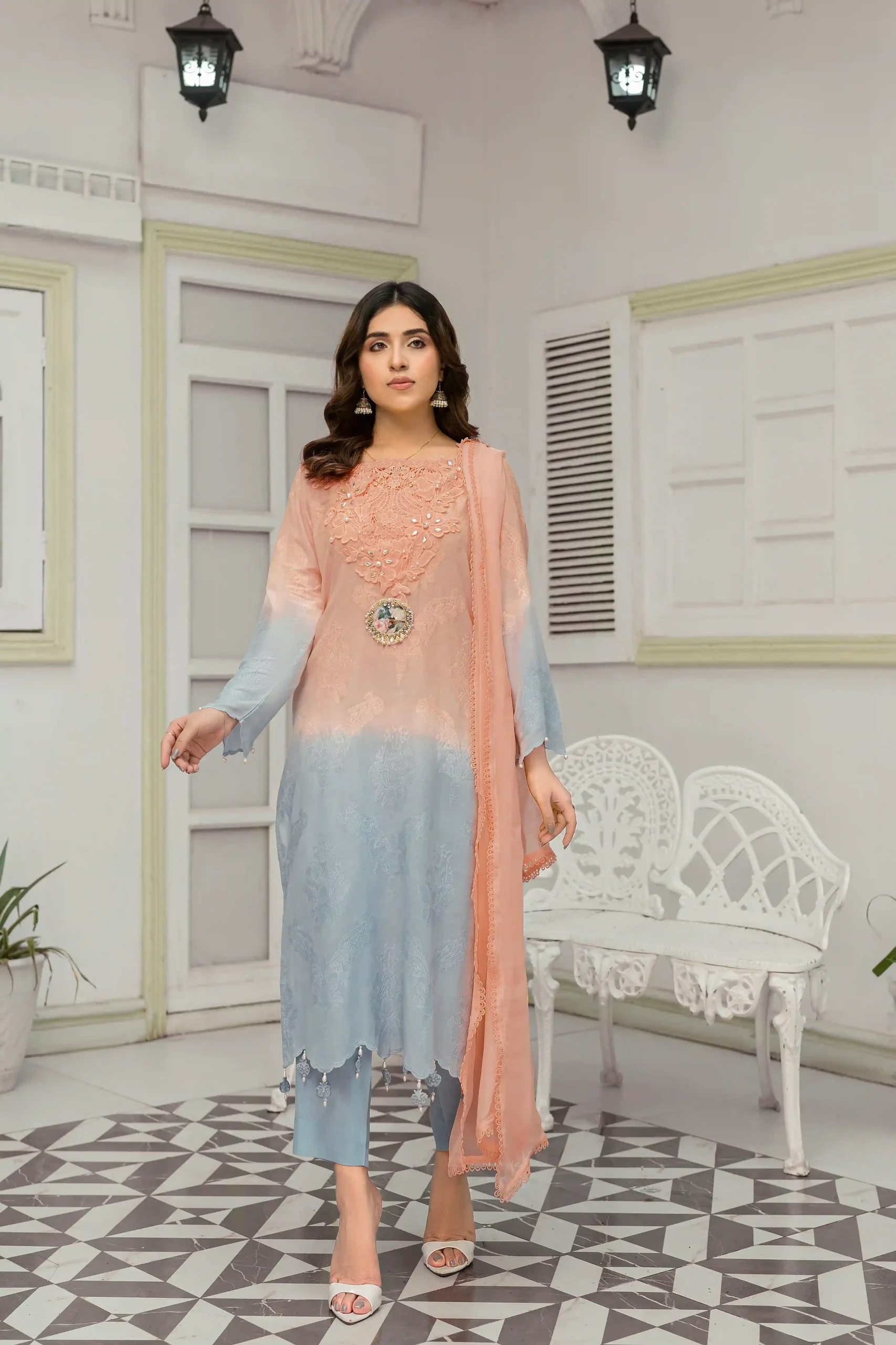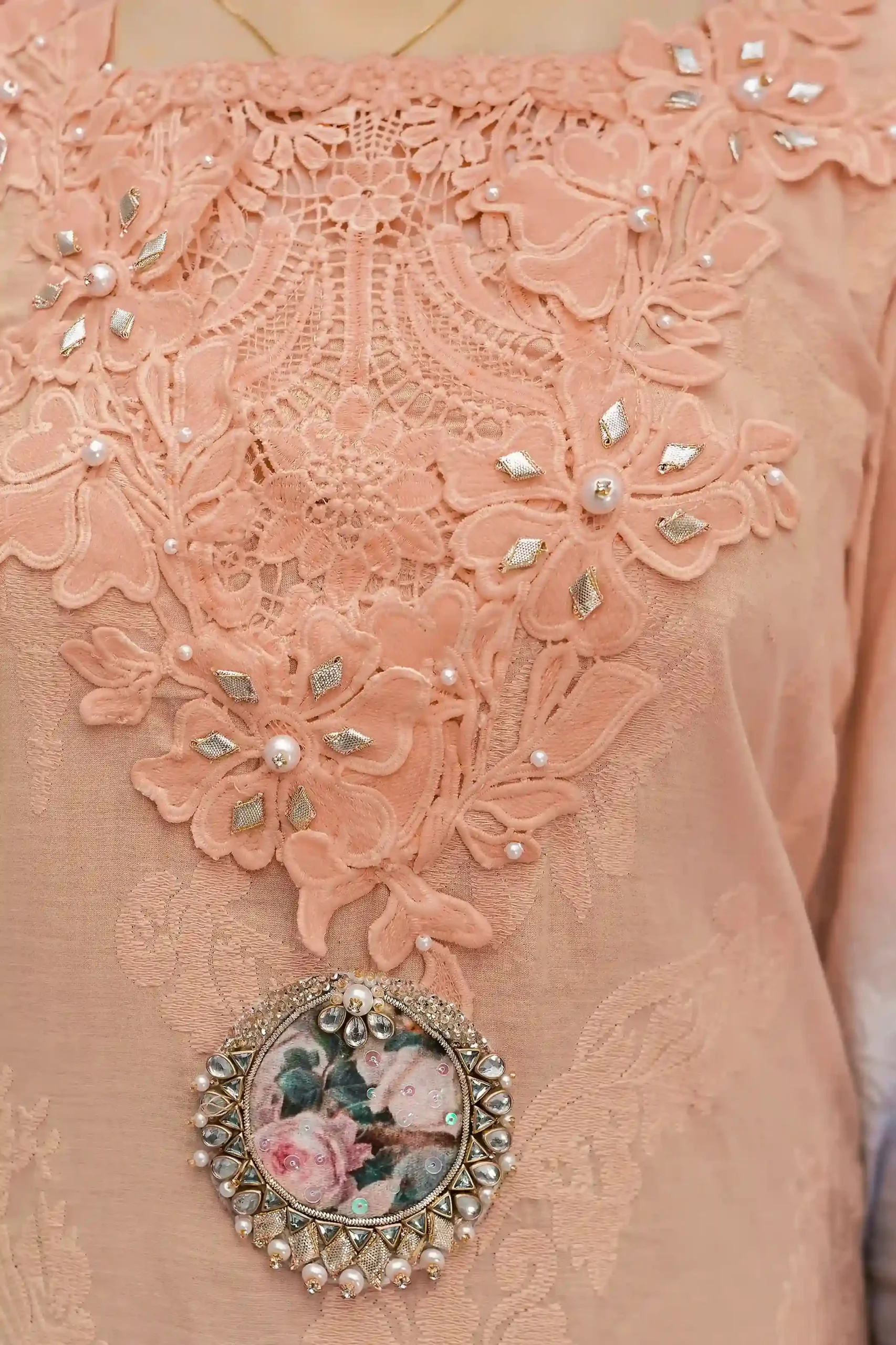 Neckline is adorned with 3D Floral embroidery patchwork decorated with embellishment and distinctive handmade motif in the centre. Hand-made customised hangings at the bottom captivates the gaze.