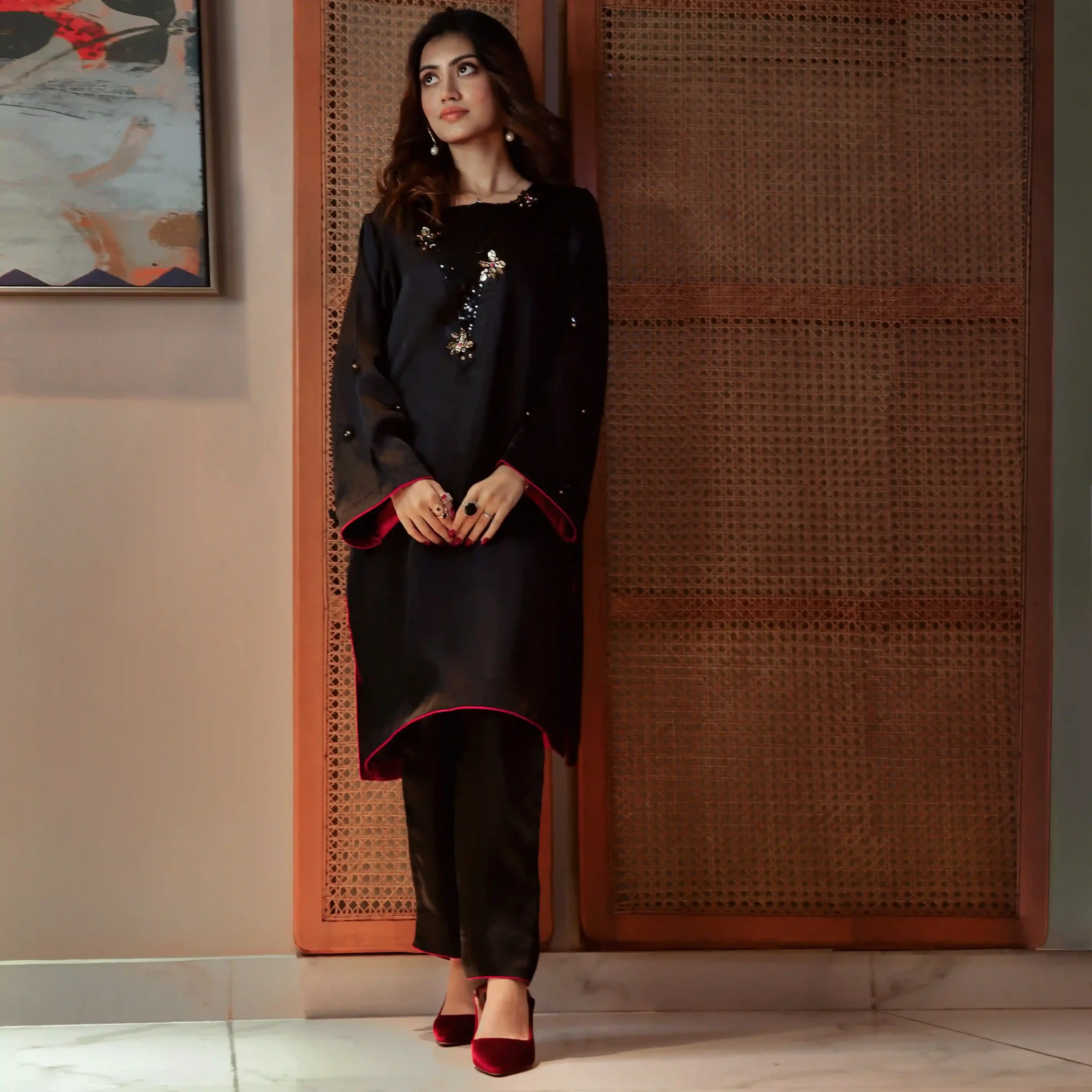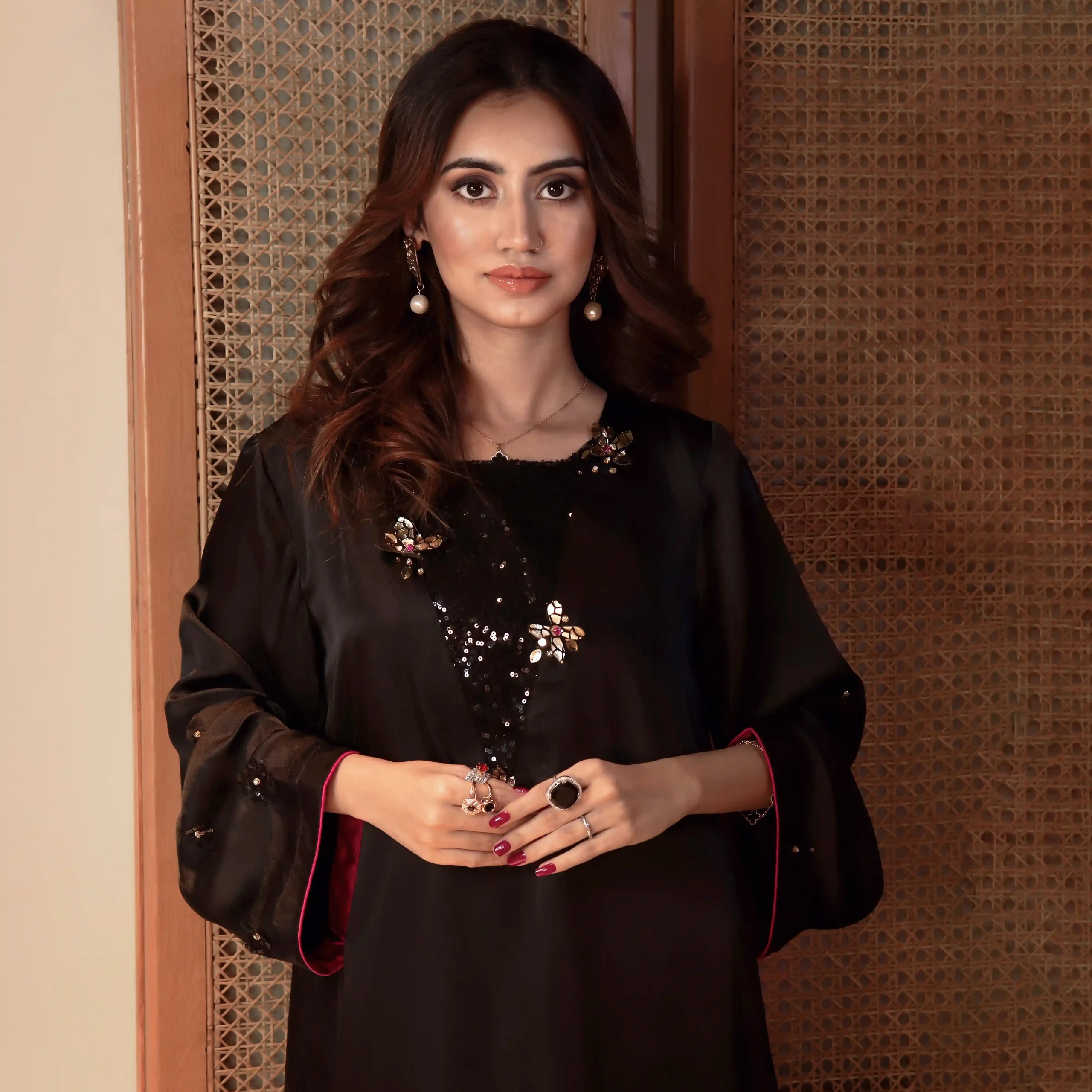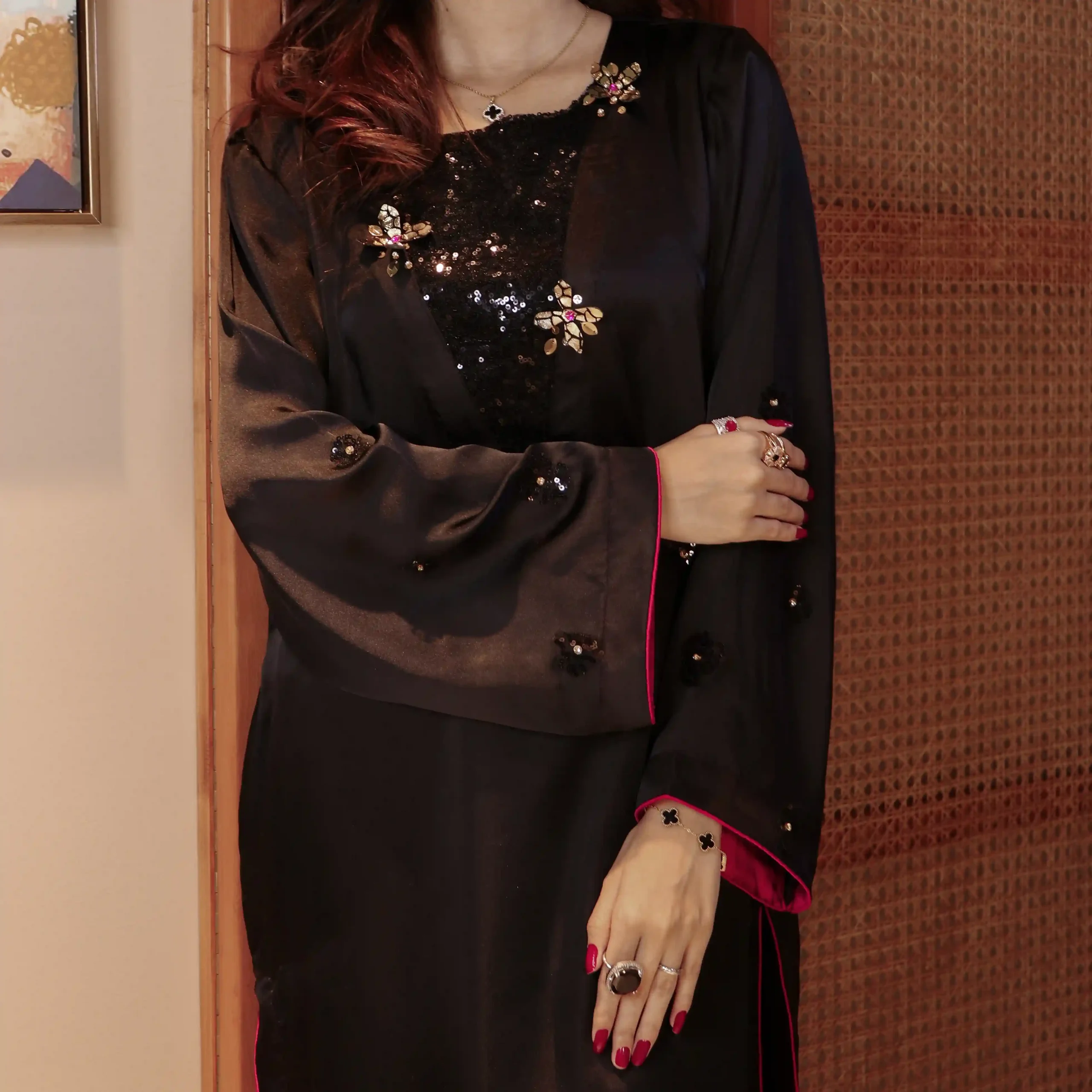 Description: This appealing rich in color design has gold 3D flowers and adorned with sequins and stonework. Hot pink pipping around the edges elevate its charm.