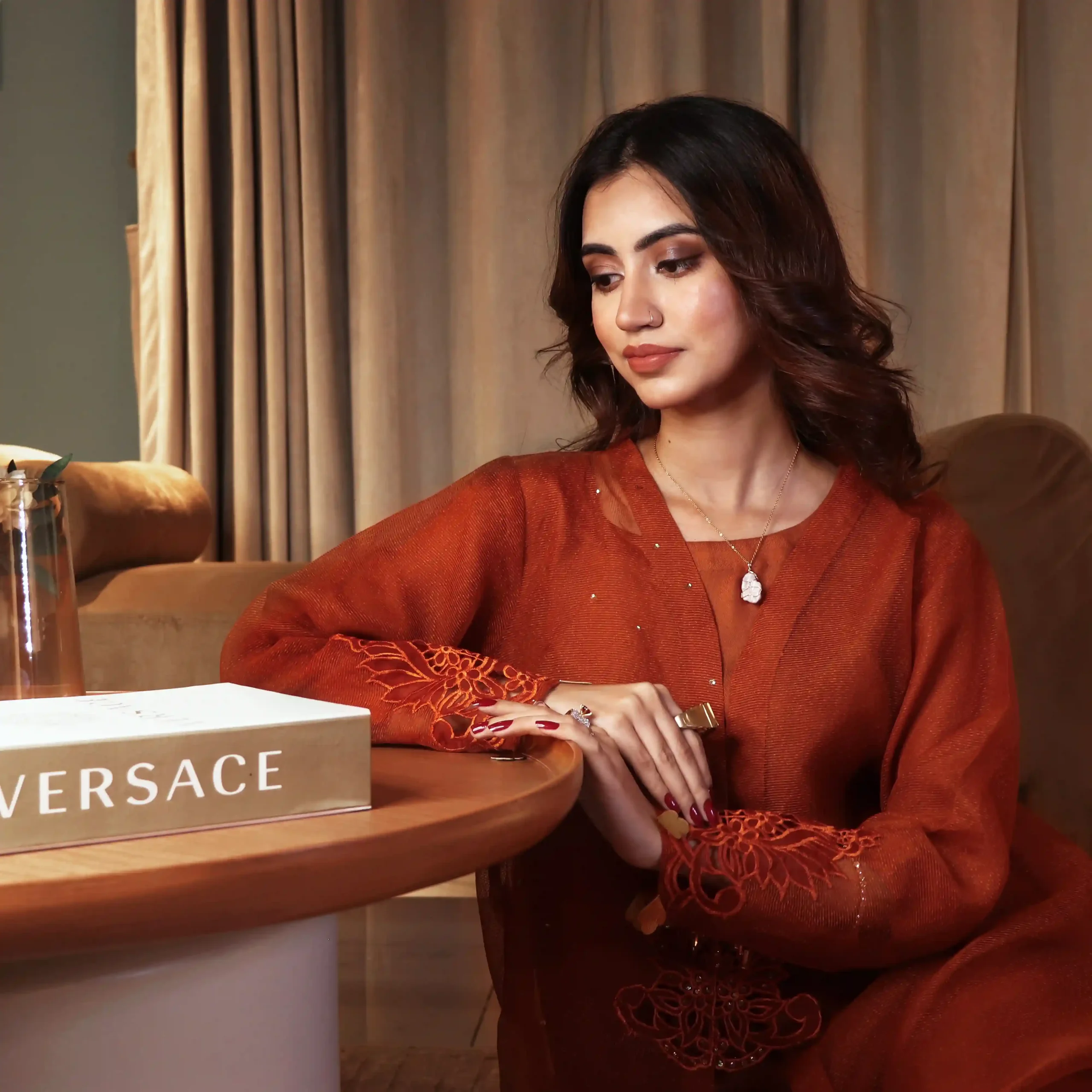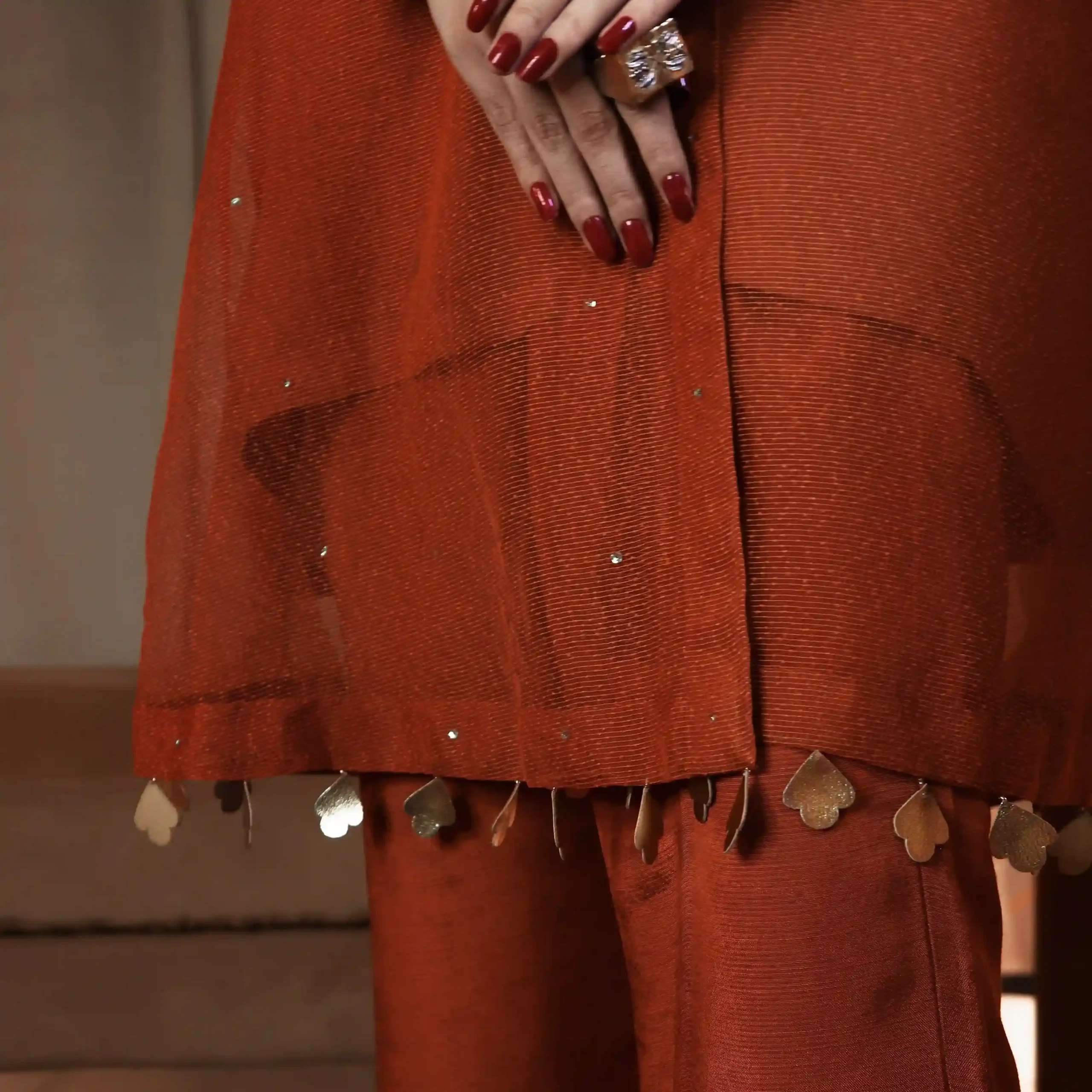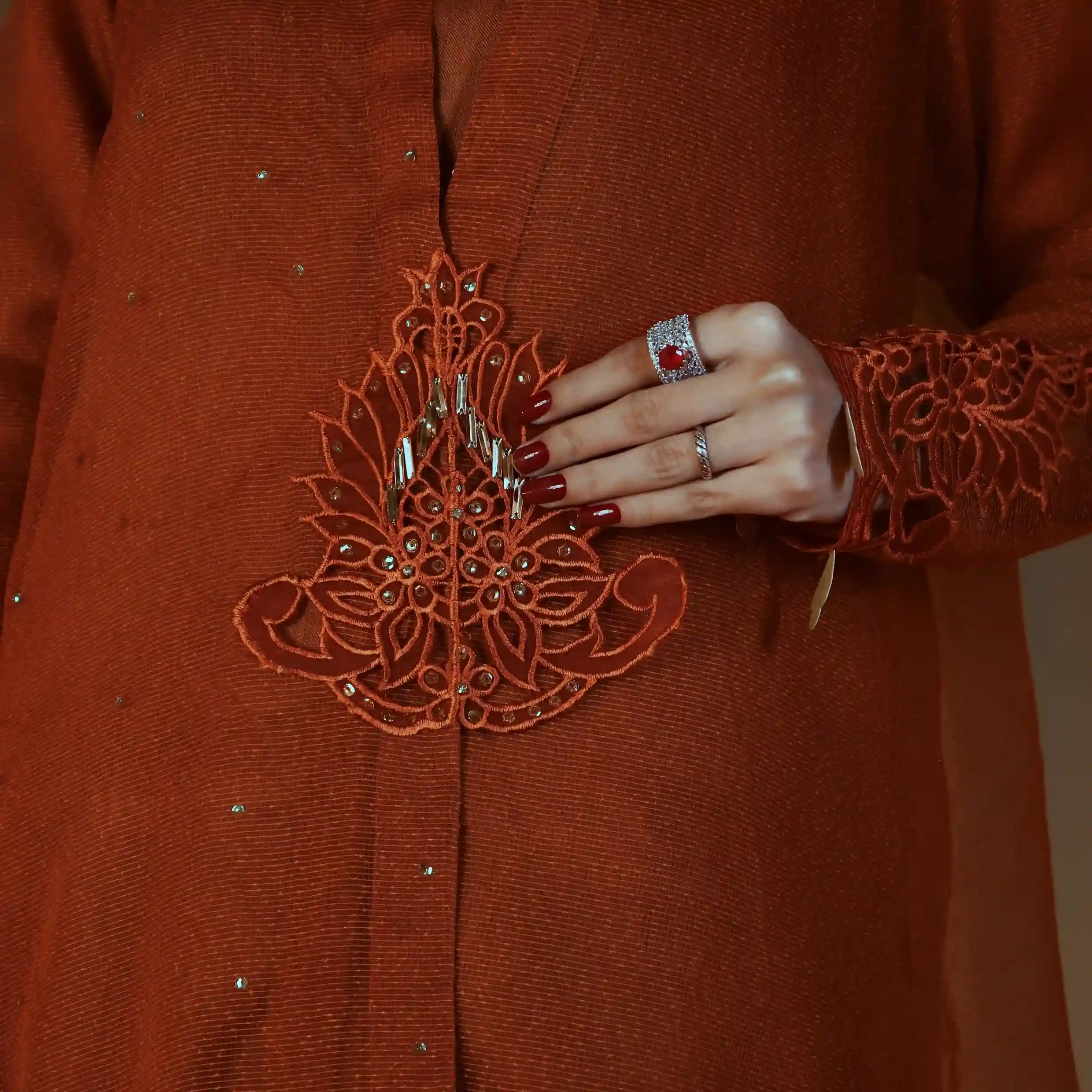 Description: Overlapping net gown in striking hue dazzled with floral embriodery patches and embellished with sequins. Mettalic gold hangings at the bottom add a magnificent touch.